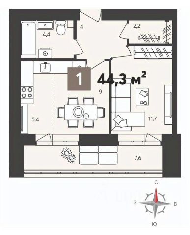 Общая площадь: 44,01 м2