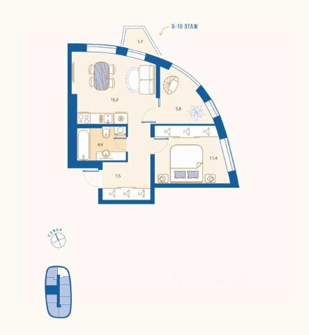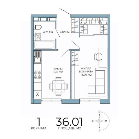 При продаже остается практически вся мебель и техника: кух.гарнитур, обеденный стол со стульями, стенка под ТВ в комнате, диван, шкаф-купе, кондиционер.