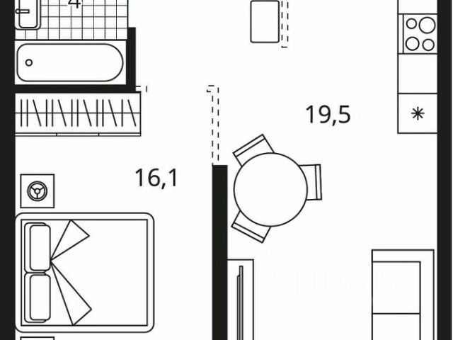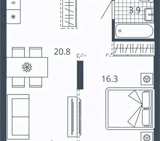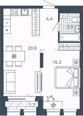 ОБЩ. ПЛОЩ. КВАРТИРЫ (с учётом лоджии): 53,6 кв.м (кухня-гостиная 14,6, комната 16,8, коридор 10,6, сан. узел совмещен. 5,0, лоджия 6,6).