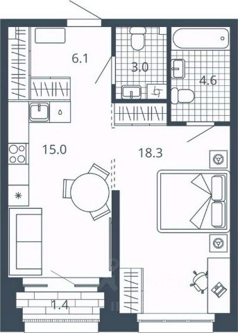 Такая планировка очень комфорта для проживания не только одного человека, но и для семьи с ребенком.