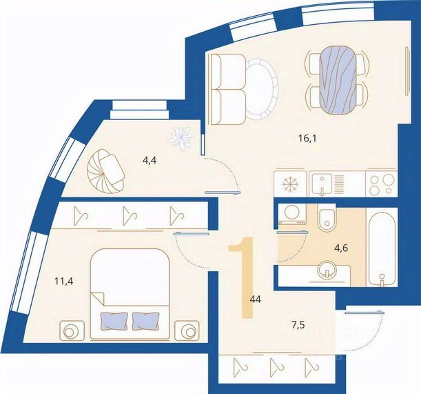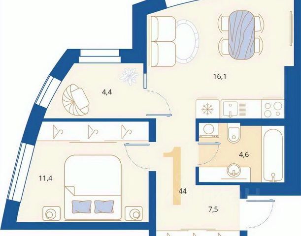 Общая площадь: 44,01 м2