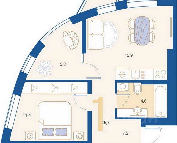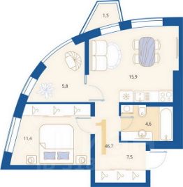 - кухня-гостиная 15,9 м2) с выходом на открытый балкон;