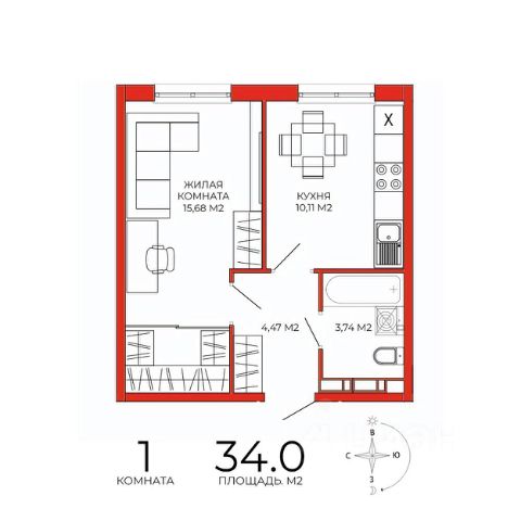- кухня-гостиная 15,9 м2) с выходом на открытый балкон;
