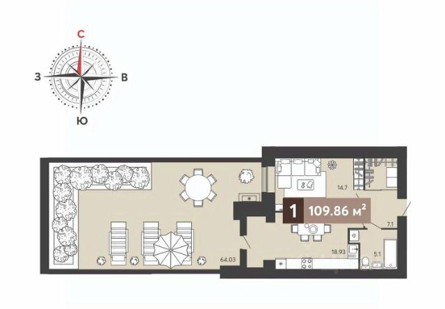 cуммapнaя плoщaдь гостинoй-столовой c кухoнной зoнoй: 18.1 кв.м.