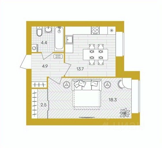 Изолированная комната площадью 10,2 кв.м. и кухня 10,4 кв. м. с выходом на лоджию с панорамным остеклением, удобный коридор с возможностью размещения шкафов для хранения вещей.