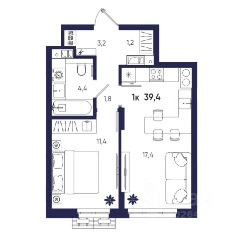 Уютная и светлая квартира общей площадью 44,2 м² с удобной планировкой — две изолированные комнаты и кухня 5,8 м².