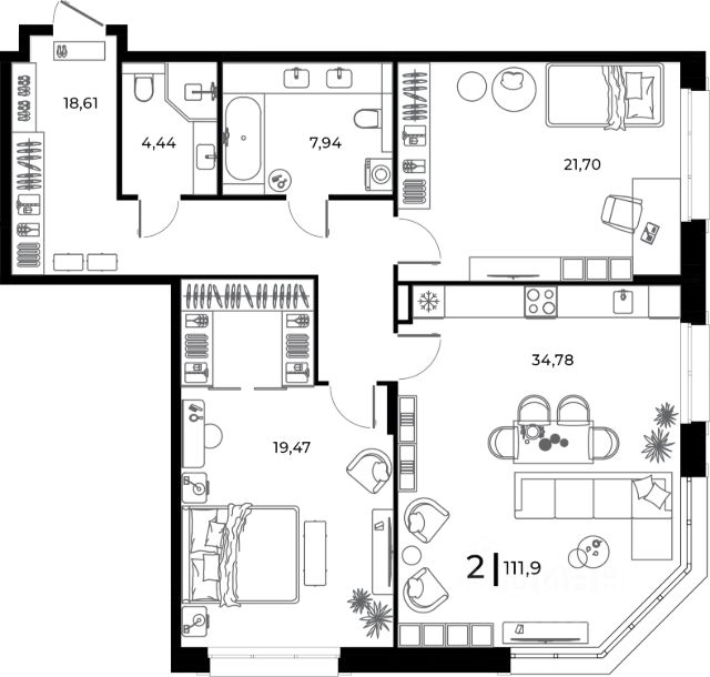 - Грамотная планировка — изолированные комнаты, выход из кухни на лоджию с панорамным остеклением.