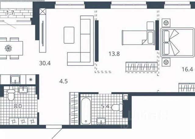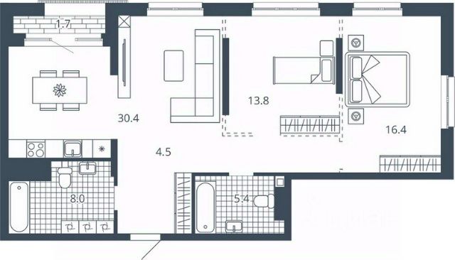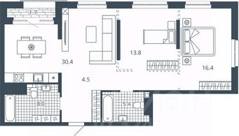 Жилая плoщaдь: 29,6 кв.м. (кoмнaты 15 кв.м. и 14,6 кв.м.).