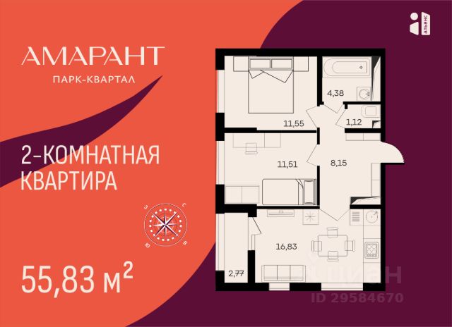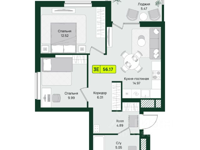 Общая площадь 52,6 м² + лоджия 5,9 м² (можно сделать зимний сад или место для кофе). Комнаты: 16 и 12 метров — настоящая распашонка, не проходная! Детская и спальня не мешают друг другу. Кухня 10 метров — развернуться есть где.