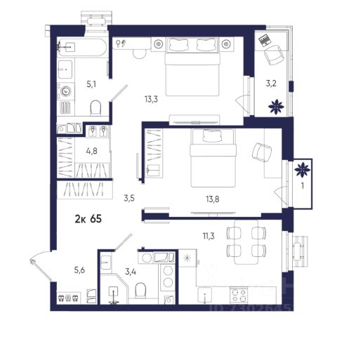 2. Планировка квартиры 44м2 евродвушка, есть: