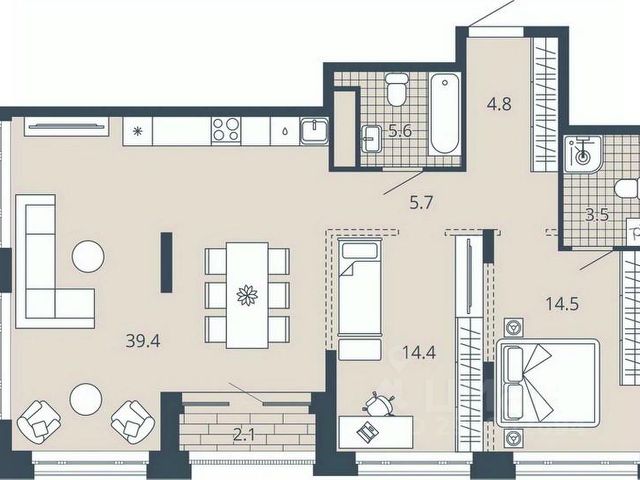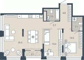 Просторная 2-комн. квартира с предчистовой отделкой в ЖК "Ньютон" на 7 этаже. Общая площадь: 81.15 кв.м., жилая: 40.74 кв.м., площадь просторной кухни-столовой: 14.38 кв.м. Комнаты изолированные, все окна выходят на одну сторону. В квартире одна лоджия, один совмещенный и один раздельный санузел. Высота потолков 3.1 м.