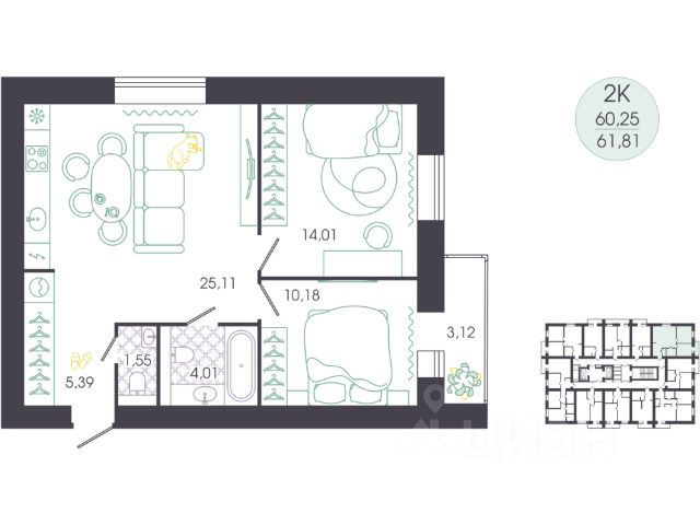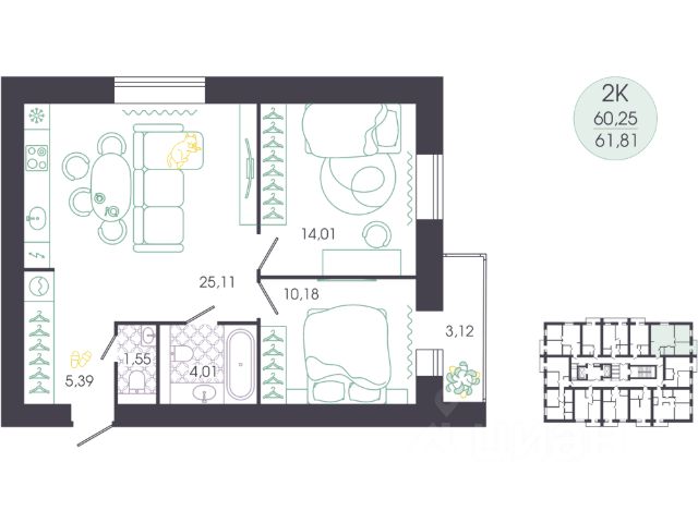 Продаётся 2-комнатная квартира в строящемся доме (Корпус 1), срок сдачи: IV-кв. 2027, общей площадью 61.81 кв.м., на 11 этаже. Новый жилой комплекс "Доброе" от застройщика "ГК Автор" расположен по адресу Россия, Пенза, Колышлейская улица, 7.