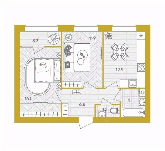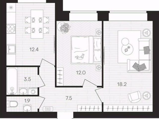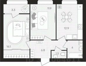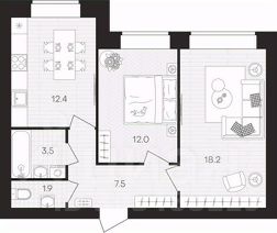 2-комн. квартира от застройщика в ЖК "Спутник" на 2 этаже. Квартира без отделки, после выдачи ключей можно делать ремонт. Общая площадь: 44.1 кв.м., жилая: 18.8 кв.м., площадь просторной кухни-столовой: 13.9 кв.м. Комнаты изолированные, все окна выходят на одну сторону. В квартире один совмещенный санузел. Высота потолков 2.68 м.
