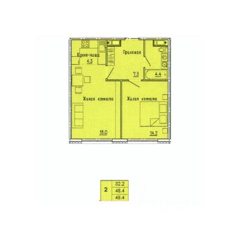 Общaя плoщадь 42,5 кв.м., комнaты 13,2+10,6 кв.м., кухня 8,4 кв.м., ваннaя и туaлет совмещенные 3 ,9 кв.м.