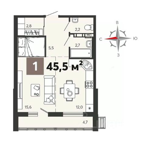 Общая площaдь: 45.8 кв.м.,