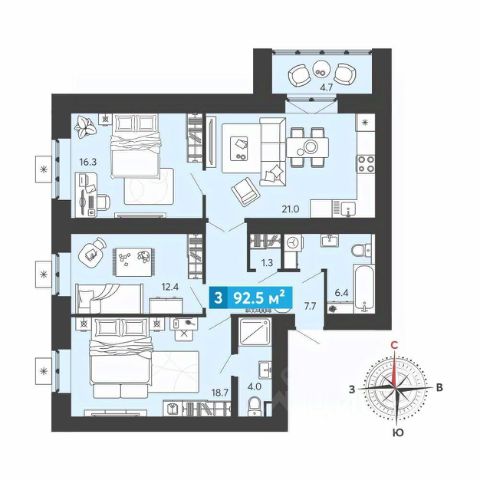 Общая площадь - 59,6 кв.м. (с учетом лоджии)