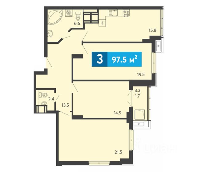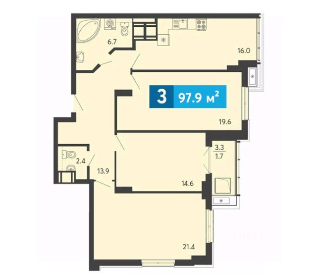 ОБЩ. ПЛОЩ. КВАРТИРЫ (с учётом 2-х лоджий): 120,7 кв.м (кухня-гостиная 43,0, детская 21,4, спальня 16,0, коридор 19,2, два сан. узла 7,2 + 4,3, две лоджии 6,0 + 3,6).