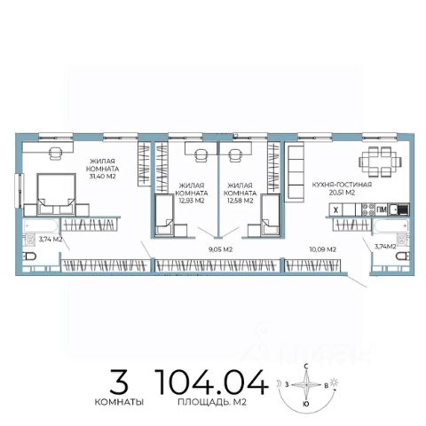 -3 комнаты правильной формы 14,15 и 16 м²,