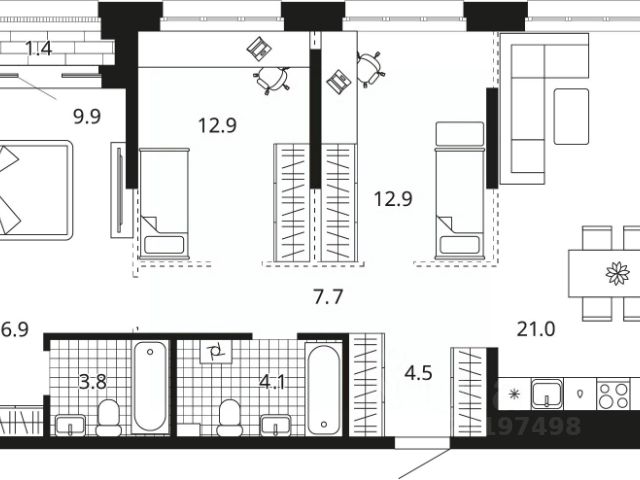 ОБЩ. ПЛОЩАДЬ КВАРТИРЫ (без учёта балкона): 78,7 кв.м (3 изолирован. комнаты 21,5 + 15,6 + 14,3, кухня 9,6, коридор 11,5, ванная 3,7, сан. узел 1,3, три кладовки 0,4 + 0,4 + 0,4) + балкон 0,9 кв.м.