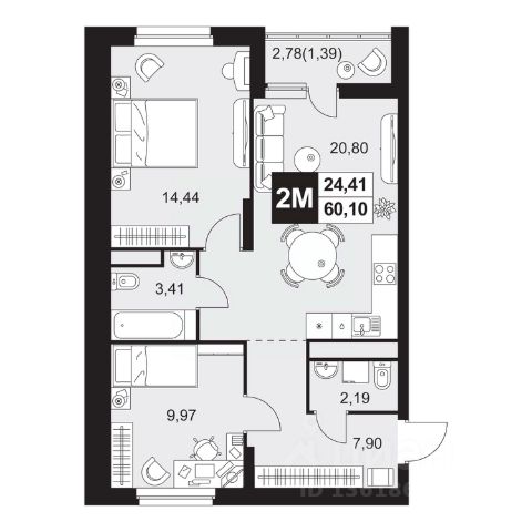 2. Планировка квартиры 44м2 евродвушка, есть: