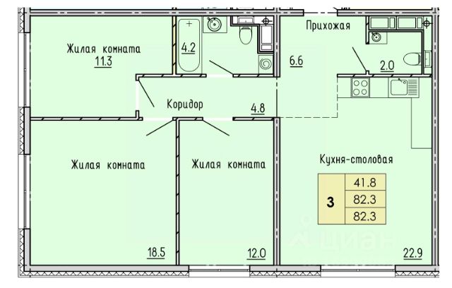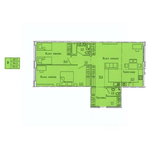 Общая площадь квартиры составляет 65.8 кв.м.,