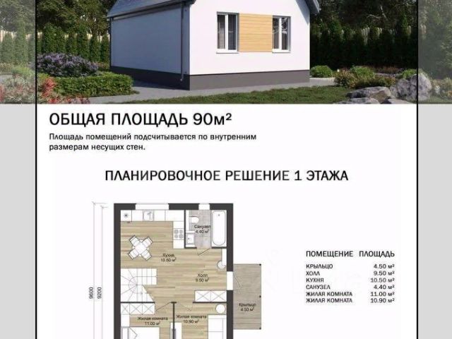1 этаж: прихожая (3.2 кв.м.), гардеробная (10 кв.м), холл (19.2 кв.м), гостиная- кухня-столовая с выходом в сад (55.4 кв.м.), санузел (9 кв.м.).