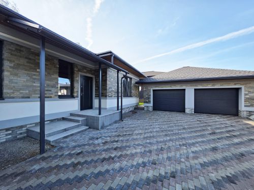 Участок перед домом и гаражом замощён цветной тротуарной плиткой, уложенной на бетонное основание.