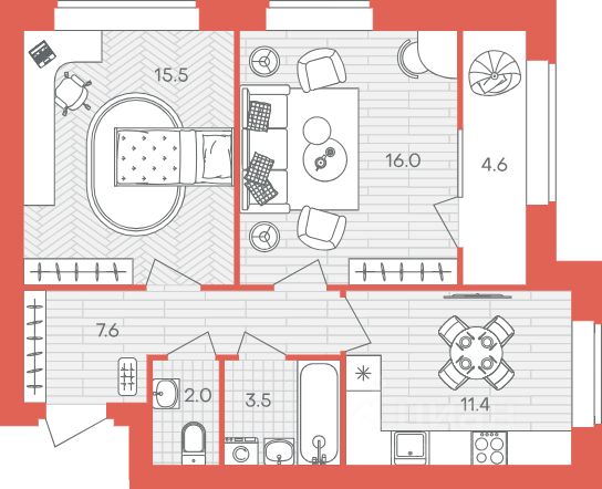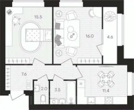 Санузел раздельный: 3,72 + 1,74 кв.м