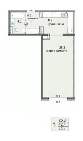 Общая площадь квартиры - 44.2 кв.м. (без учёта лоджии)