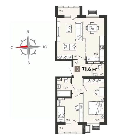 - кухня-гостиная 15,9 м2) с выходом на открытый балкон;