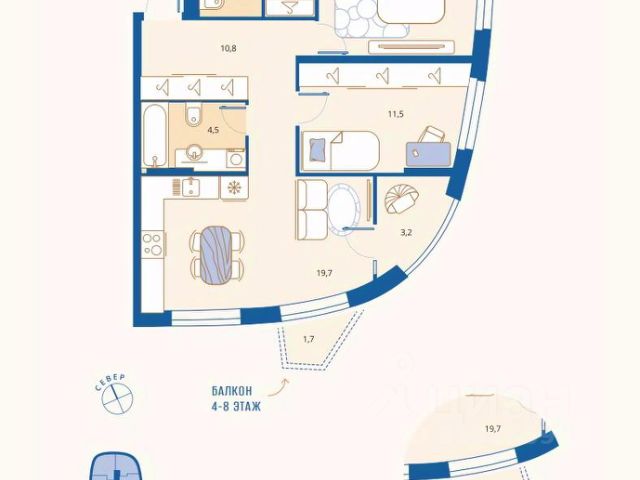 Жилая зона: мастер-спальня 11,6 кв.м с собственной гардеробной 2,4 кв.м. и своим санузлом 3 кв.м., вторая спальня 11,5 кв.м.