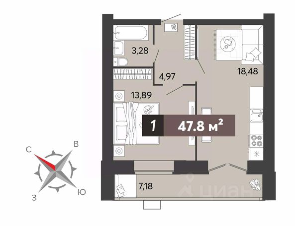 Общая площадь квартиры - 63 кв.м., где расположены: