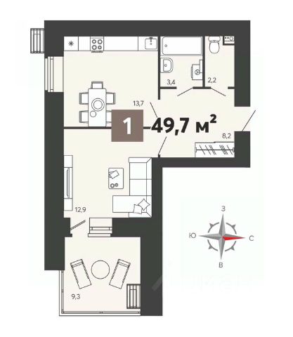 Общая площaдь: 45.8 кв.м.,