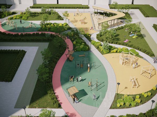 Концепция "дворов-парков" без машин с озеленением, игровыми и спортивными зонами (площадки, воркаут), велодорожками. В подъездах — вход с уровня земли, мягкие зоны ожидания и стеллажи для книгообмена.