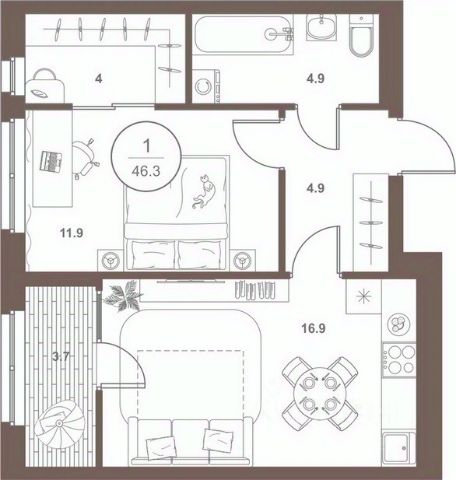 Жилая зона: мастер-спальня 11,6 кв.м с собственной гардеробной 2,4 кв.м. и своим санузлом 3 кв.м., вторая спальня 11,5 кв.м.