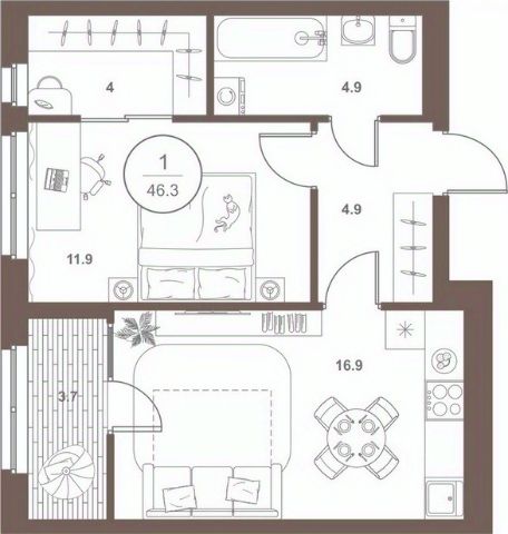 Просторный общий санузел 4,9 кв.м.