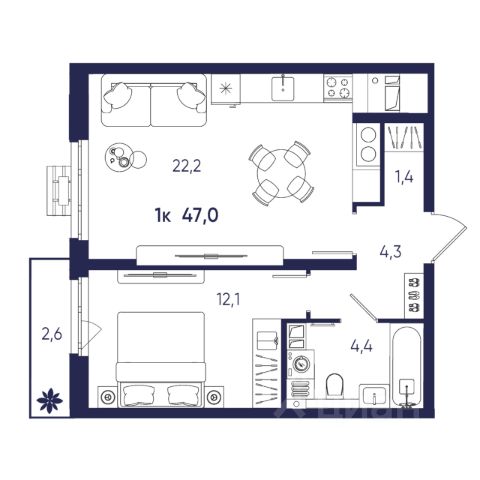 - кухня-гостиная с обеденной зоной, диваном и телевизором;