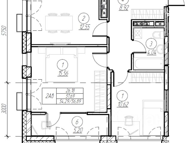 Общая площадь: 56 кв.м. ( с учетом лоджии )