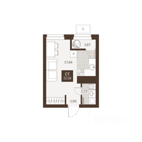 ОБЩ. ПЛОЩ. КВАРТИРЫ (с учётом лоджии): 19,66 кв.м (кухня-гостиная 11,35, коридор 2,29, сан. узел совмещенный 2,82, лоджия 3,2).