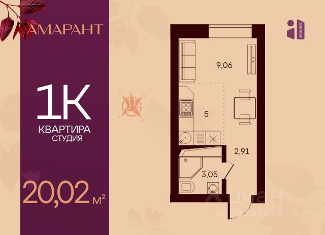 ОБЩ. ПЛОЩ. КВАРТИРЫ (с учётом лоджии): 19,66 кв.м (кухня-гостиная 11,35, коридор 2,29, сан. узел совмещенный 2,82, лоджия 3,2).