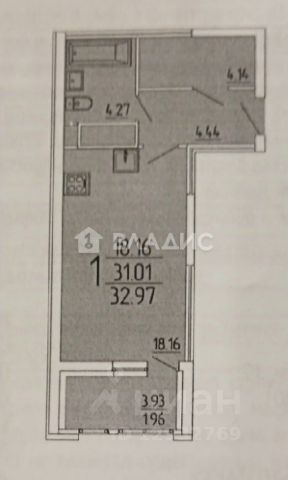 ОБЩ. ПЛОЩ. КВАРТИРЫ (с учётом лоджии): 19,66 кв.м (кухня-гостиная 11,35, коридор 2,29, сан. узел совмещенный 2,82, лоджия 3,2).