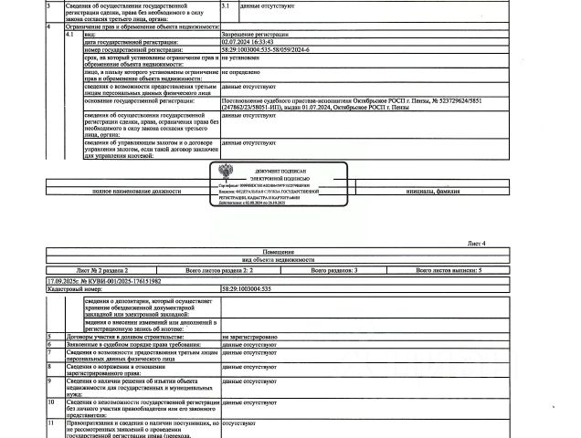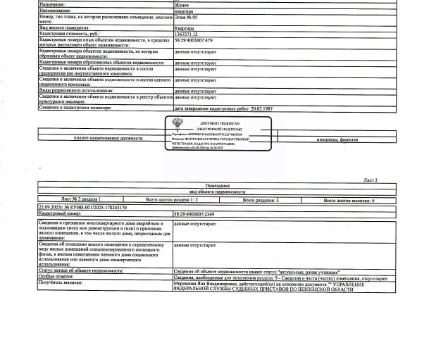 Данные получены с сайта ГИС Торги. Жилое помещение (квартира) общей площадью 29 кв.м., кад. 58:29:4003007:2369, этаж 5, расположенное в пределах объекта недвижимости с кад. 58:29:4003007:479, принадлежащее должнику Глухову Д.М. По месту нахождения объекта зарегистрированные лица отсутствуют. Сведениями о задолженности по коммунальным платежам и взносам на капитальный ремонт, а также о фактическом состоянии объекта недвижимости организатор торгов не располагает. Техническая документация и фотографии объекта отсутствуют у организатора торгов.
