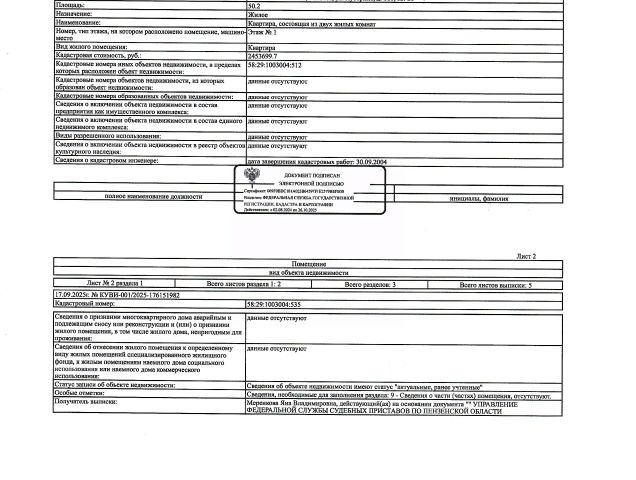 Данные получены с сайта ГИС Торги. Жилое помещение (квартира) общей площадью 50,2 кв.м., , кад. 58:29:1003004:535, этаж 1, расположенное в пределах объекта недвижимости с кад. 58:29:1003004:512, принадлежащее должнику Смирнову Д.И. По месту нахождения объекта зарегистрированные лица отсутствуют. Сведениями о задолженности по коммунальным платежам и взносам на капитальный ремонт, а также о фактическом состоянии объекта недвижимости организатор торгов не располагает. Техническая документация и фотографии объекта отсутствуют у организатора торгов.