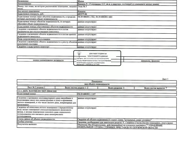 Данные получены с сайта ГИС Торги. Жилое помещение (комната 15) площадью 13,2 кв.м., кад. 58:29:4002011:1187, находящееся в пределах объектов недвижимости с кад. 58:29:4002011:502 и 58:29:4002011:603, принадлежащее должнику Борисову В.А. Зарегистрировано двое гражданин. Сведениями о размере задолженности по коммунальным услугам и взносам на капитальный ремонт, а также о фактическом состоянии объекта недвижимости, организатор торгов не располагает. Ключи, техническая документация и фотографии объекта отсутствуют у организатора торгов.