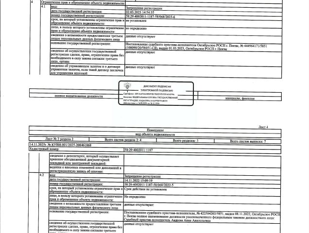 Данные получены с сайта ГИС Торги. Жилое помещение (квартира) общей площадью 29 кв.м., кад. 58:29:4003007:2369, этаж 5, расположенное в пределах объекта недвижимости с кад. 58:29:4003007:479, принадлежащее должнику Глухову Д.М. По месту нахождения объекта зарегистрированные лица отсутствуют. Сведениями о задолженности по коммунальным платежам и взносам на капитальный ремонт, а также о фактическом состоянии объекта недвижимости организатор торгов не располагает. Техническая документация и фотографии объекта отсутствуют у организатора торгов.