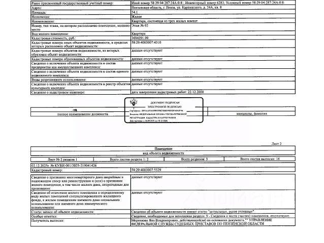 Данные получены с сайта ГИС Торги. Жилое помещение (квартира) общей площадью 34,7 кв.м., кад. 58:29:4003002:3272, находящееся в пределах объекта недвижимости с кад. 58:29:4003002:437, принадлежащее должнику Московцеву А.М. Сведениями о зарегистрированных лицах, о фактическом состоянии имущества, о задолженности по коммунальным платежам и взносам на капитальный ремонт организатор торгов не располагает. Техническая документация и фотографии объектов организатору торгов не передавались.