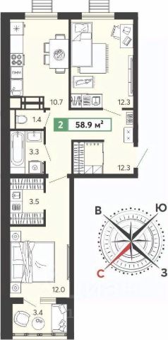 Просторная 2-комн. квартира в ЖК "Спутник" на 2 этаже. Квартира без отделки, полностью готова к чистовой отделке и дальнейшему ремонту. Общая площадь: 58.9 кв.м., жилая: 24.3 кв.м., площадь просторной кухни-столовой: 10.7 кв.м. Квартира - распашонка, без проходных комнат, окна выходят на paзные стороны дома. В квартире одна лоджия, один раздельный санузел. Высота потолков 2.68 м.