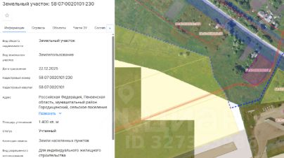 Земельный участок, государственная собственность на который не разграничена, свободный от прав третьих лиц, площадью 1400 (одна тысяча четыреста) кв. м., из категории земель — земли населенных пунктов, с кадастровым номером 58:0...