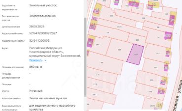 Земельный участок с кадастровым номером 52:54:1200002:2027, площадь 860 кв.м., вид разрешенного использования для ведения личного подсобного хозяйства, категория земель земли населенных пунктов.