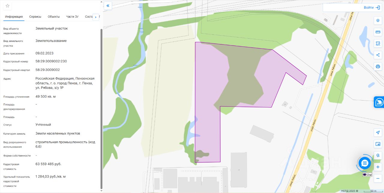 Адрес: Российская Федерация, Пензенская область, г. о. город Пенза, г. Пенза, ул. Рябова, з/у 1Р. Площадь: 49500 кв. м. Кадастровый номер: 58:29:3009002:230. Разрешенное использование (назначение): строительная промышленность (6.6).